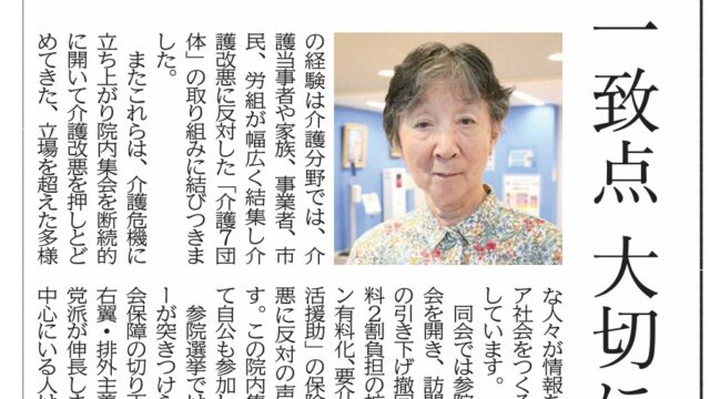 Topics(最新情報) 9月28日付しんぶん赤旗に掲載されました 9月28日付しんぶん赤旗に、「ケア社会をつくる会」世話人である小島美里さんのインタビュー記事が掲載されました。編集部の許可を得て、ここにその記事のPDFと画像ファイルを掲載いたします。是非ご一読ください。しんぶん赤旗に掲載された記事 2025.09.30 Topics(最新情報)