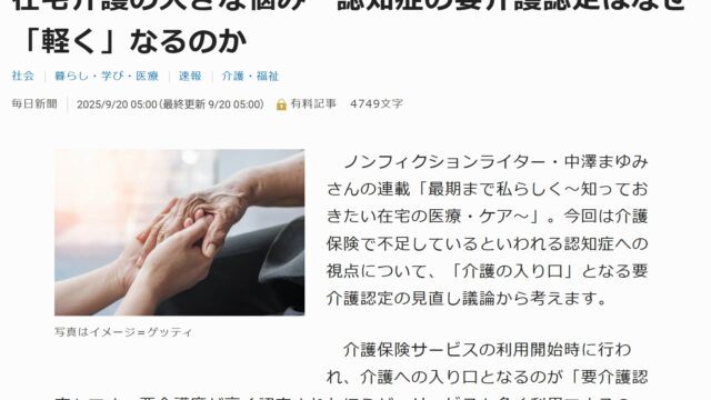 Topics(最新情報) 在宅介護の大きな悩み 認知症の要介護認定はなぜ「軽く」なるのか 中澤まゆみさんがご執筆されたコラムです。要介護認定(1次判定)の見直しと、認知症対応になっていない現在の介護保険の問題点について書かれています。有料記事なので途中までしか読めませんが、大事なテーマですのでシェアします。是非ご覧ください。最期... 2025.09.25 Topics(最新情報)