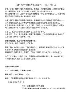 会の最後には参加者一同で、介護保険制度の改善を求めて国や自治体に対して行動を起こしていくことを宣言し、アピール文を採択しました。