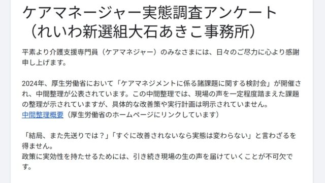 令和新選組大石議員が、ケアマネージャーアンケートを実施しておられるので、お知らせいたします。
